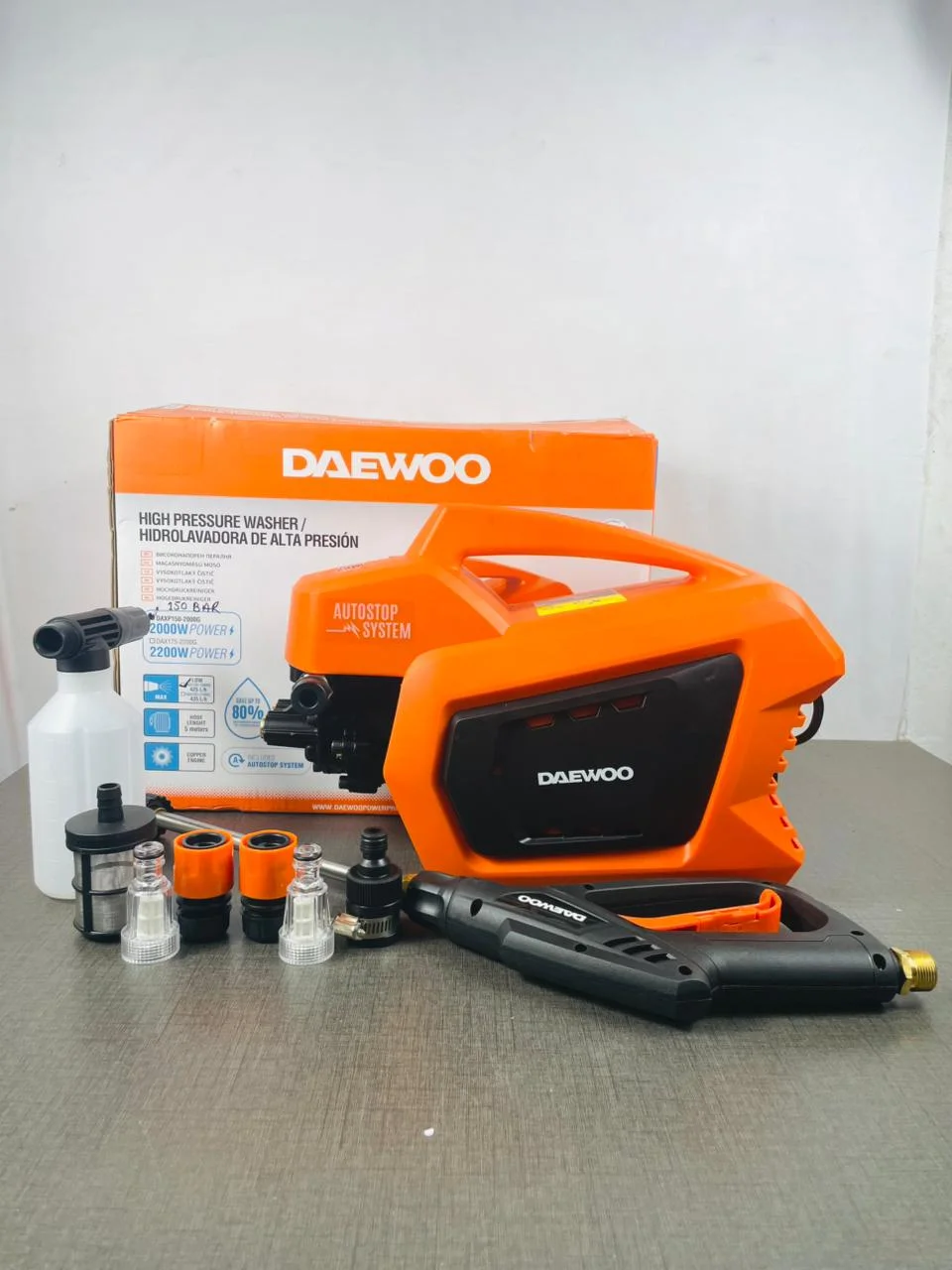 Elevate your cleaning experience with the powerful Daewoo DAXP150-2000G High Pressure Washer. Featuring Korean technology, this heavy-duty 2000W machine is designed for both efficiency and durability. It delivers a robust 150 Bar pressure and a significant flow rate of 425 L/h, making it ideal for the most demanding cleaning tasks. The reliable Induction Motor ensures a quieter operation and a longer lifespan, while the compact, wheeled design provides easy portability. From stubborn grease on driveways to delicate car paint, this high-pressure washer provides an accurate and powerful cleaning solution. Save up to 80% water compared to a regular garden hose and enjoy superior results with the Auto Stop System.